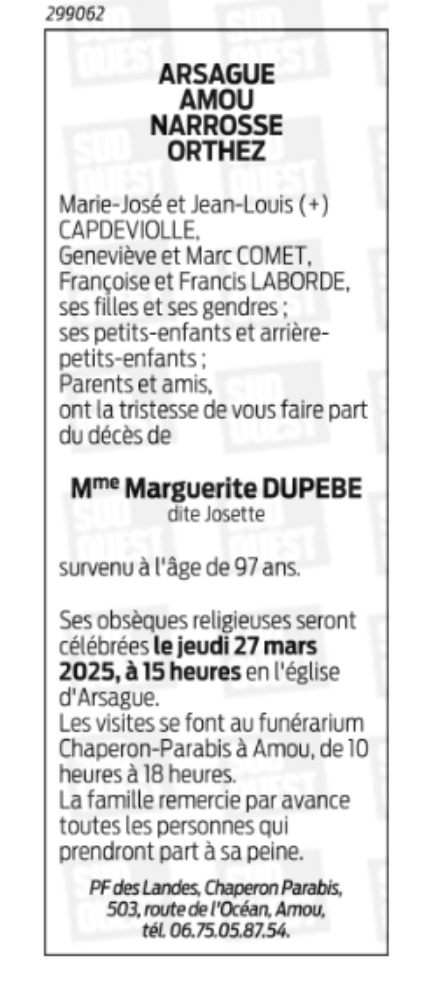Décédée à Amou (40330, France) le vendredi 21 mars 2025 à l'âge de 97 ans