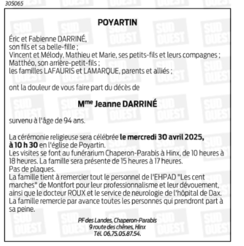 Décédée à Dax (40100, France) le samedi 26 avril 2025 à l'âge de 94 ans
