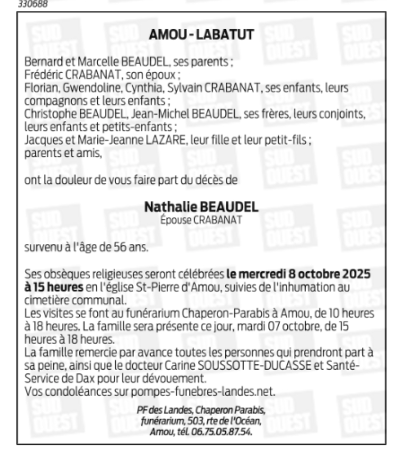 Décédée à Ossages (40290, France) le dimanche 5 octobre 2025 à l'âge de 56 ans