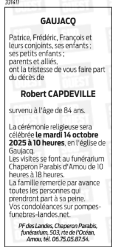 Décédé à Gaujacq (40330, France) le jeudi 9 octobre 2025 à l'âge de 84 ans