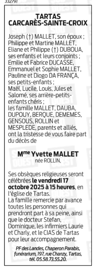 Décédée à Tartas (40400, France) le mercredi 15 octobre 2025 à l'âge de 91 ans