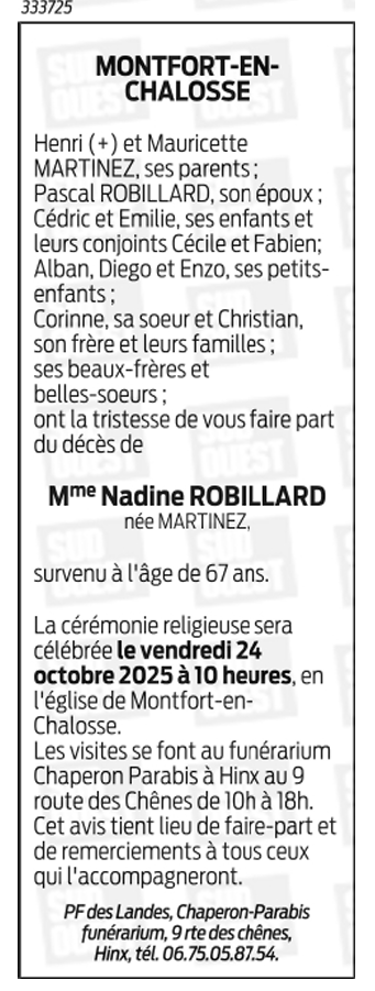Décédée à Montfort-en-Chalosse (40380, France) le lundi 20 octobre 2025 à l'âge de 67 ans