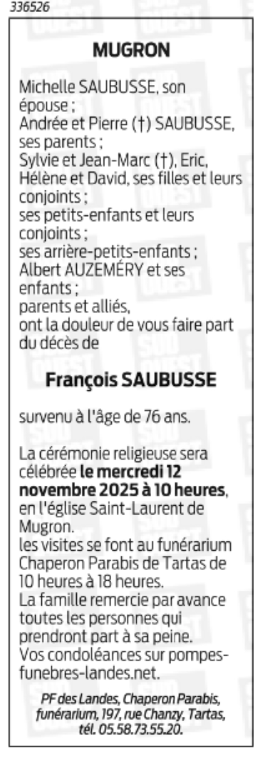 Décédé à Mugron (40250, France) le vendredi 7 novembre 2025 à l'âge de 76 ans