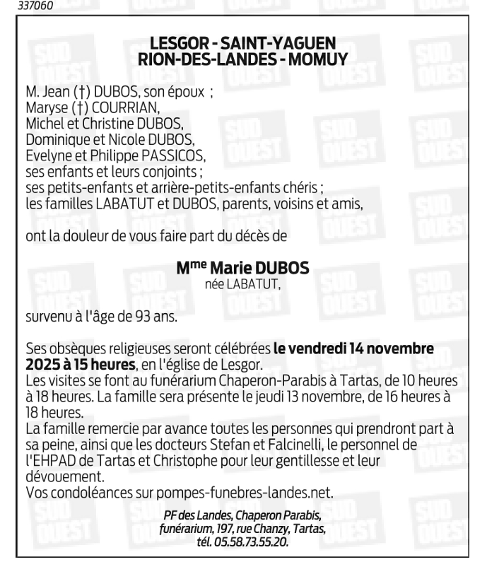 Décédée à Tartas (40400, France) le lundi 10 novembre 2025 à l'âge de 93 ans
