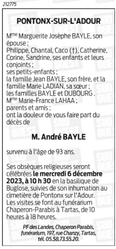 Décédé à Pontonx-sur-l'Adour (40465, France) le lundi 4 décembre 2023 à l'âge de 93 ans