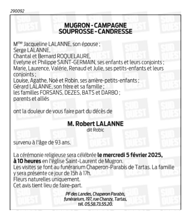 Décédé à Mugron (40250, France) le dimanche 2 février 2025 à l'âge de 93 ans