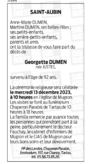 Née à Saint-Aubin (40250, France) le samedi 25 juillet 1931