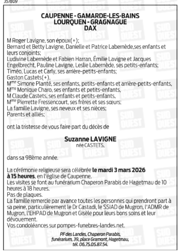 Décédée à Dax (40100, France) le vendredi 27 février 2026 à l'âge de 97 ans