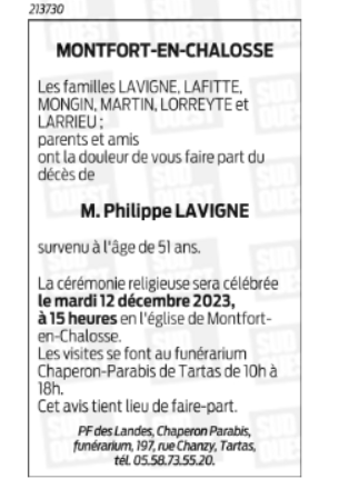 Décédé à Montfort-en-Chalosse (40380, France) le vendredi 8 décembre 2023 à l'âge de 51 ans