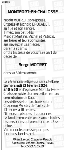 Décédé à Dax (40100, France) le vendredi 16 février 2024 à l'âge de 79 ans