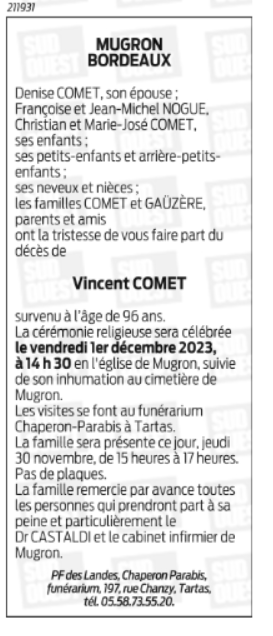 Décédé à Mugron (40250, France) le mercredi 29 novembre 2023 à l'âge de 96 ans