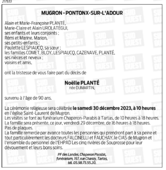 Décédée à Mont-de-Marsan (40000, France) le mercredi 27 décembre 2023 à l'âge de 90 ans